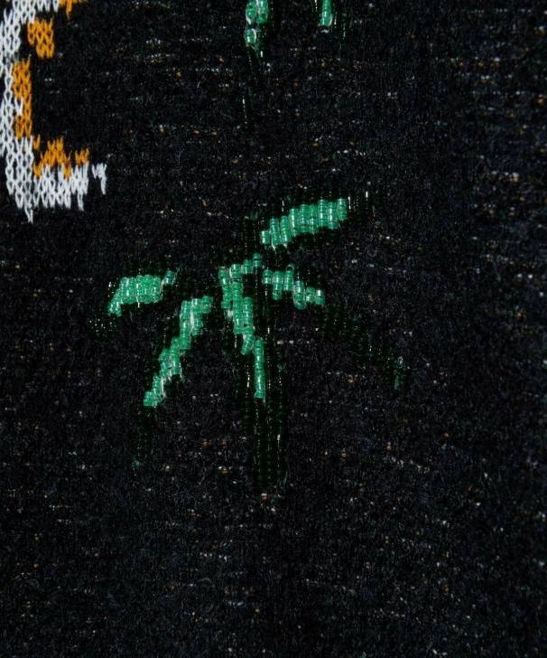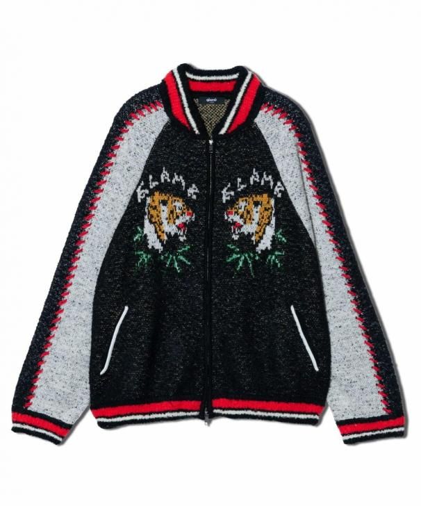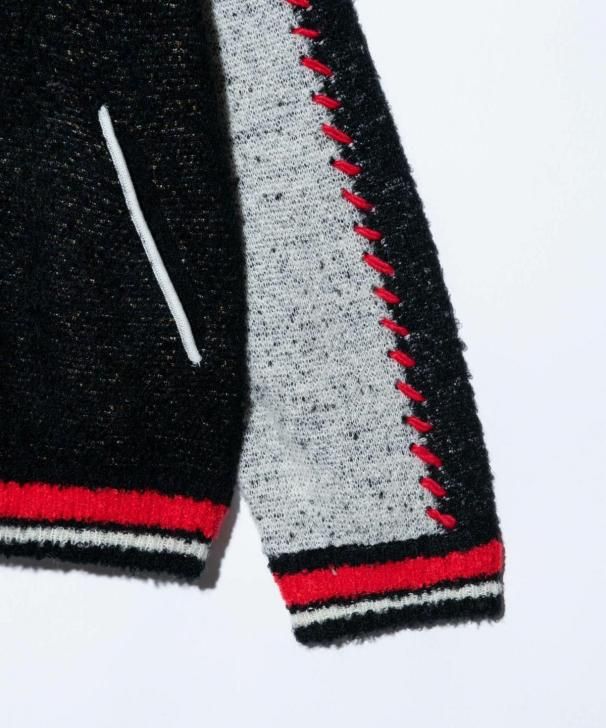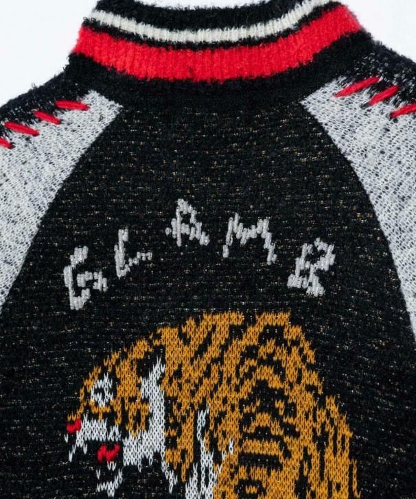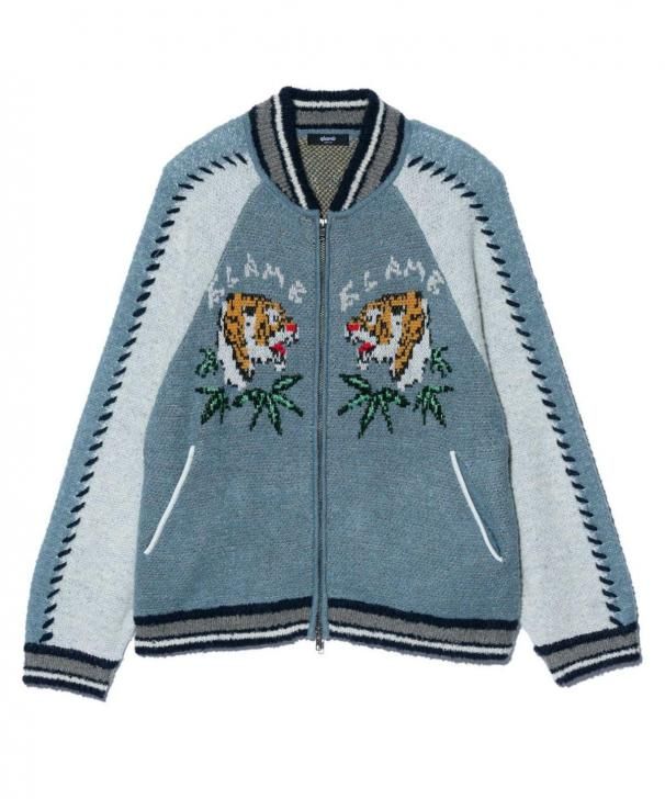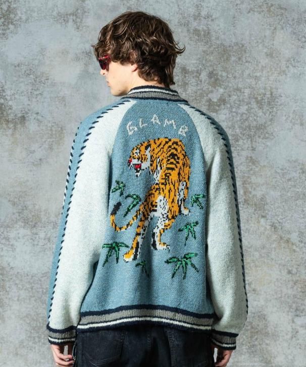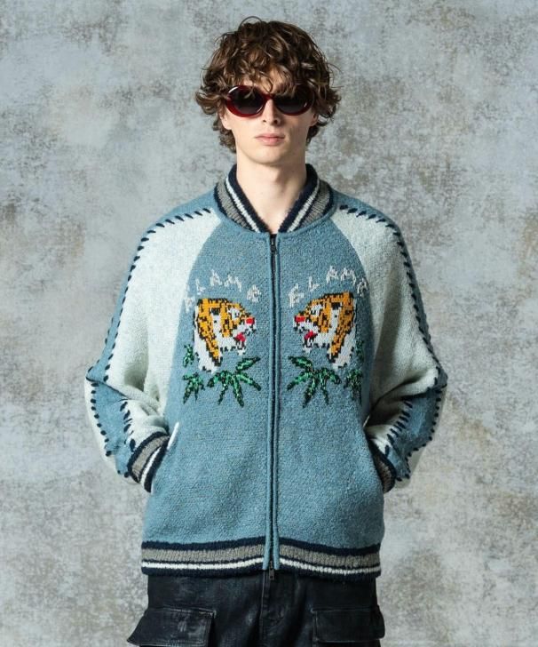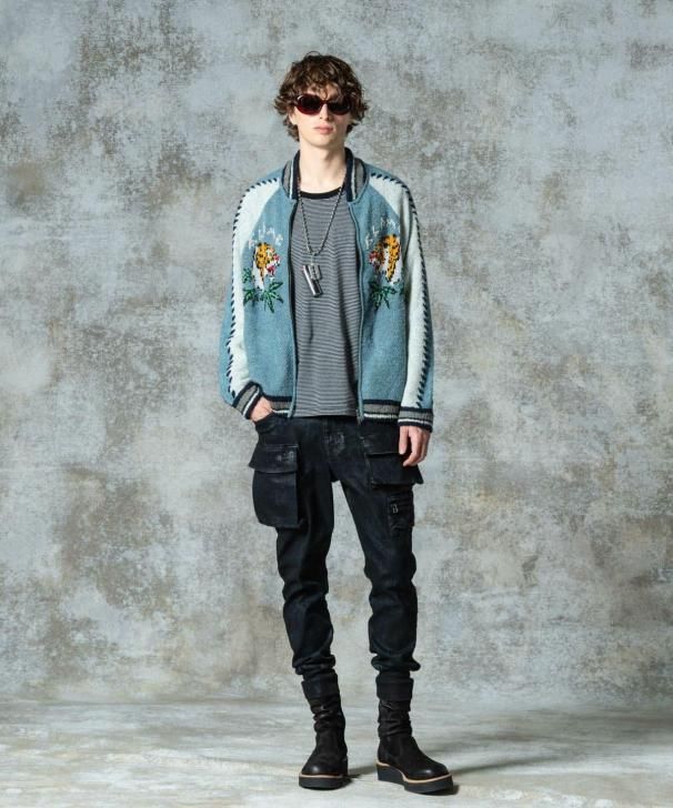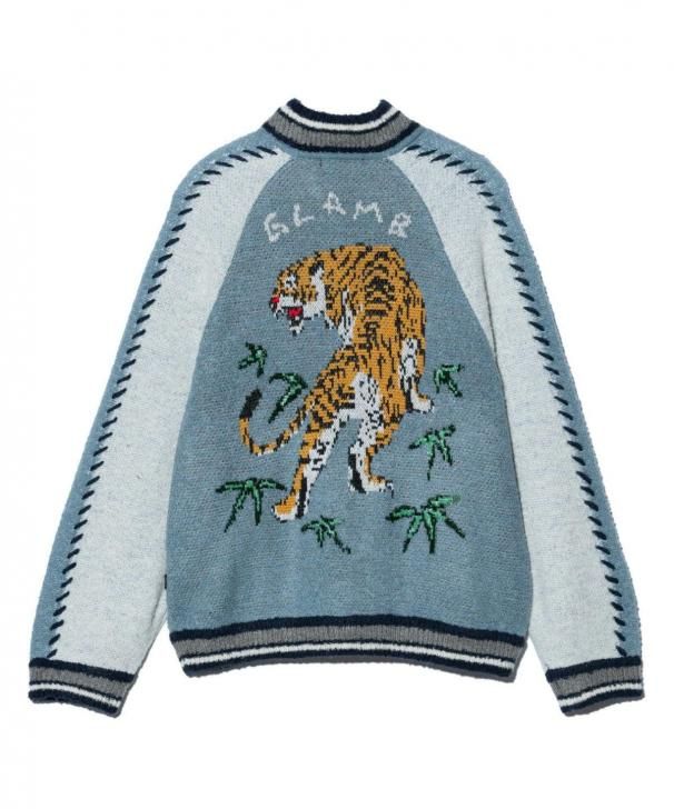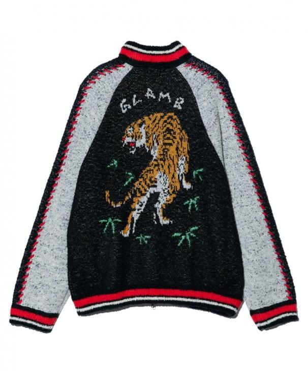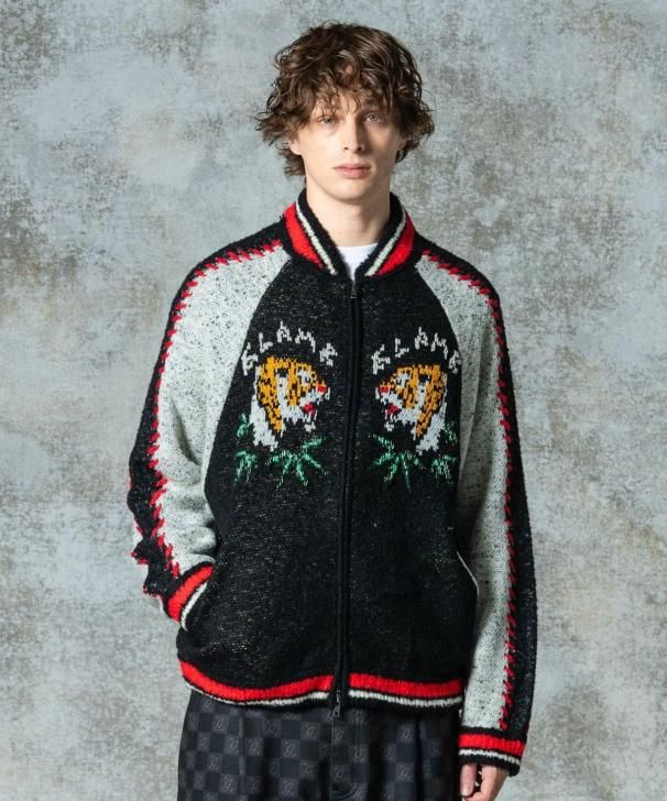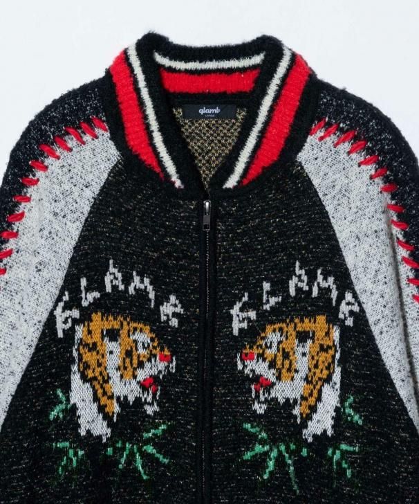 “Dance in Hidden Valley”をコレクションテーマに日常と幻想が混濁した世界観を提案する今季のglamb、ブランドアイコンであるスーベニアジャケットを異素材で再構築したKnit Ska Jumper。ラグランスリーブのボディにオリエンタル柄をあしらったデザインはスカジャンパーの定番ながら、テキスタイル使いをサテン生地からニットに変更。虎柄はジャガード、ブランドロゴと笹の柄はブランドが信頼を寄せるファクトリーが時間を贅沢に使った手仕事で取り付けたビーズ、アームにはパイピングを模して太糸ステッチを施すなどアイデアある表現を随所にちりばめました。シルエットは身幅と着丈の双方をコンパクトにまとめたジャストフィッティング。アウターとしての着用に加え、さらにコートやブルゾンを合わせたWアウターレイヤードもお楽しみいただけます。