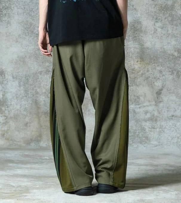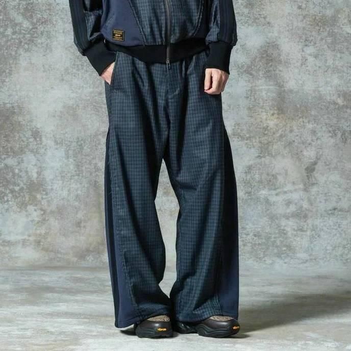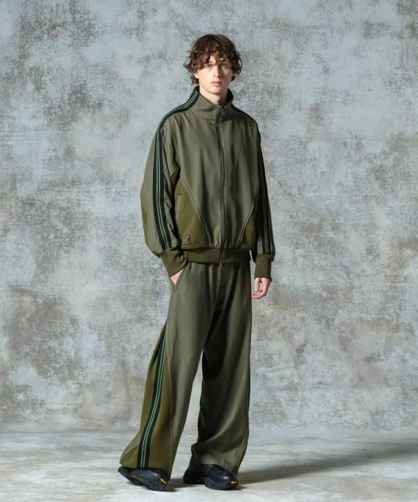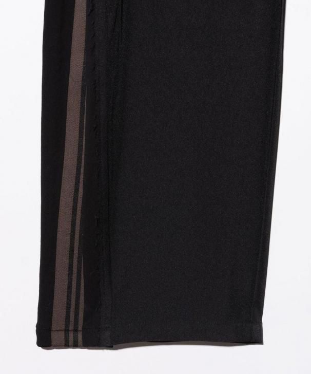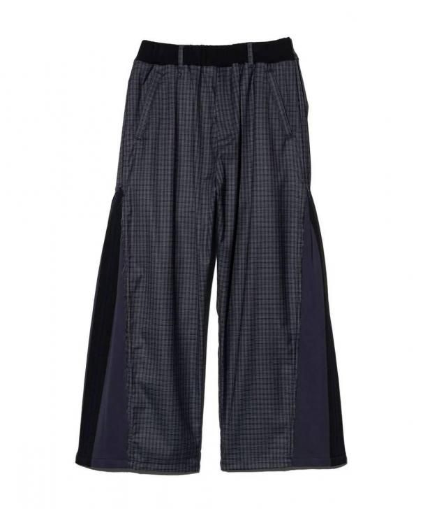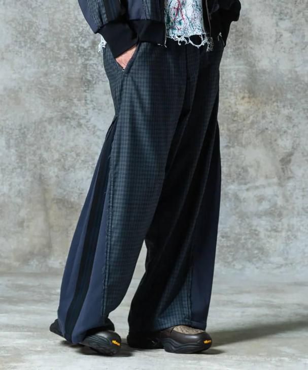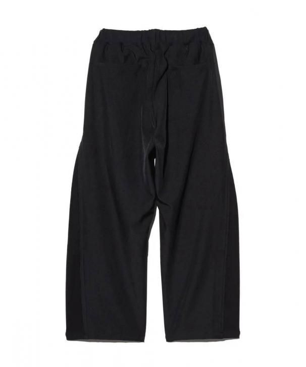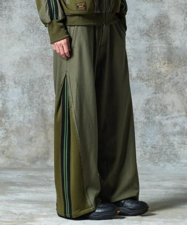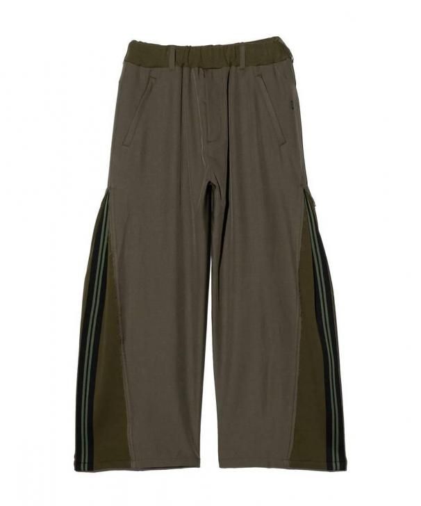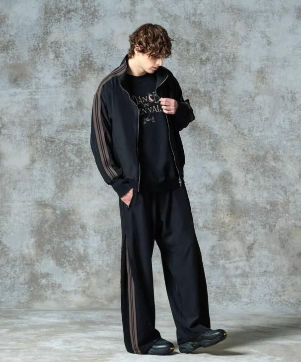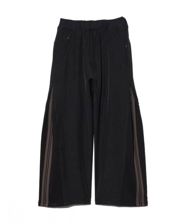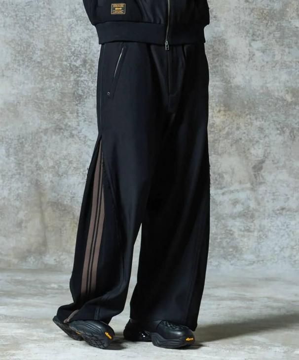 ワイドシルエットのボディはスーツ生地のサイドシーム部分を裾元までオープンし、その隙間をスウェットのフェイクレイヤードパーツで切り替え。エッジはカットオフしてほつれを加えることでglambらしいグランジのニュアンスも吹き込んだ野心的な仕上がりです。フェイクパーツにはトラックパンツを思わせるラインテープを叩きつけ。まるでさらにもう1本のパンツが隠れているかのようなトリックアート的視覚効果を演出したこちらは、セットアップ展開となるOverflow Jerseyと組み合わせることでよりコンセプチュアルなスタイリングを生み出します。