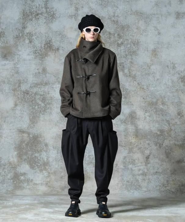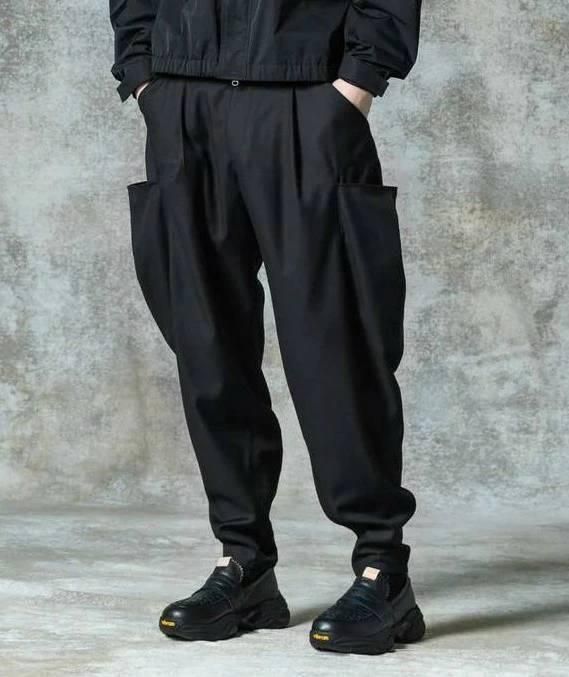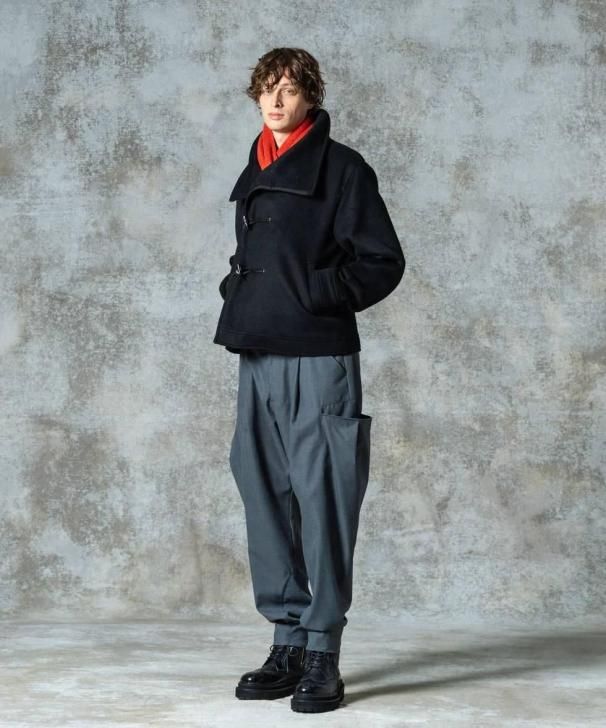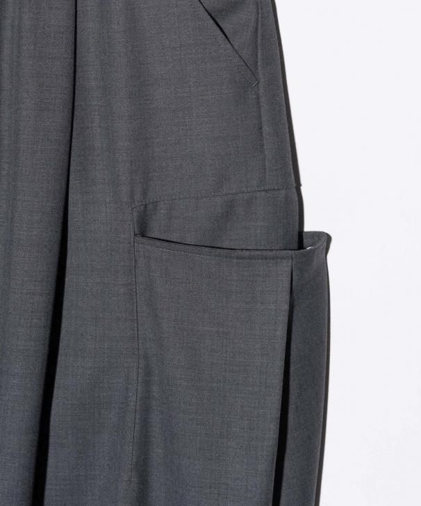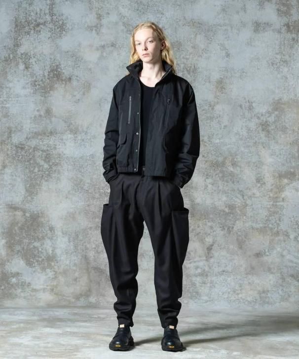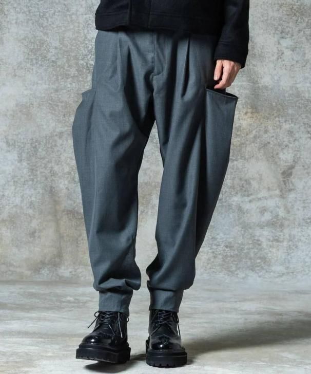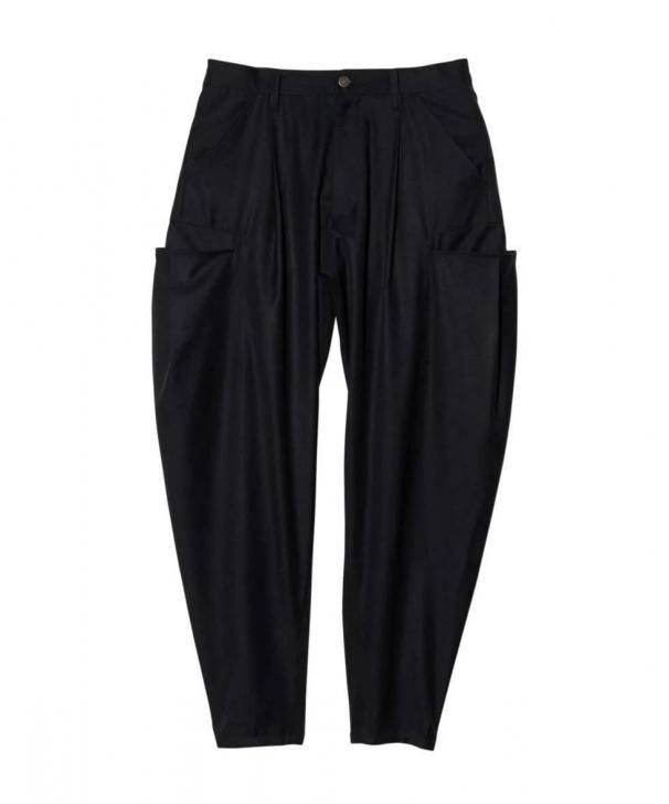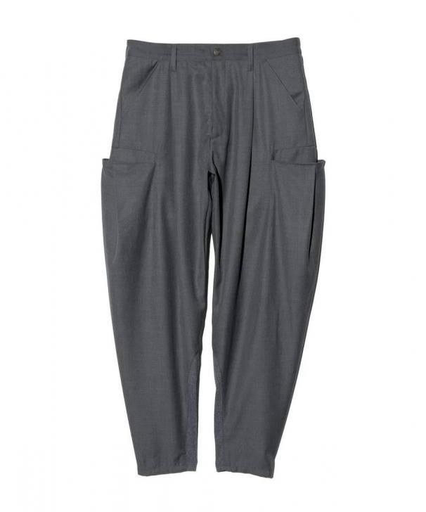 フォーマルな素材使いと独創性あるディテールワークが掛け合わされたAdditional Pocket Pants。流線形の美しいラインを描くサルエルシルエットのボディはテキスタイルにスーツ生地を使用。その両サイド膝上に外向きに開く大ぶりなサイドポケットをあしらうことでサルエルラインをさらに強調するというアイデアある仕立てを施しました。緩急あるフィッティングに合わせ、裾内側には着脱を容易にするリブを採用。デザインとユーティリティの両面にブランドの配慮が散りばめられた仕上がりとなっています。