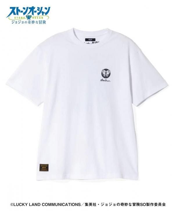 70's音楽カルチャーを彷彿とさせるホワイト/ブラックのカラーパレットを用いて、バックスタイルにオールドアメリカンなタッチで徐倫を描写。彼女がG.D.St刑務所に収監された日付も添えて、美しく強い女性としてのキャラクター像を表現しています。フロントでは胸元に作品を象徴する蝶のモチーフをプリントし、コンセプチュアルな佇まいにまとめています。